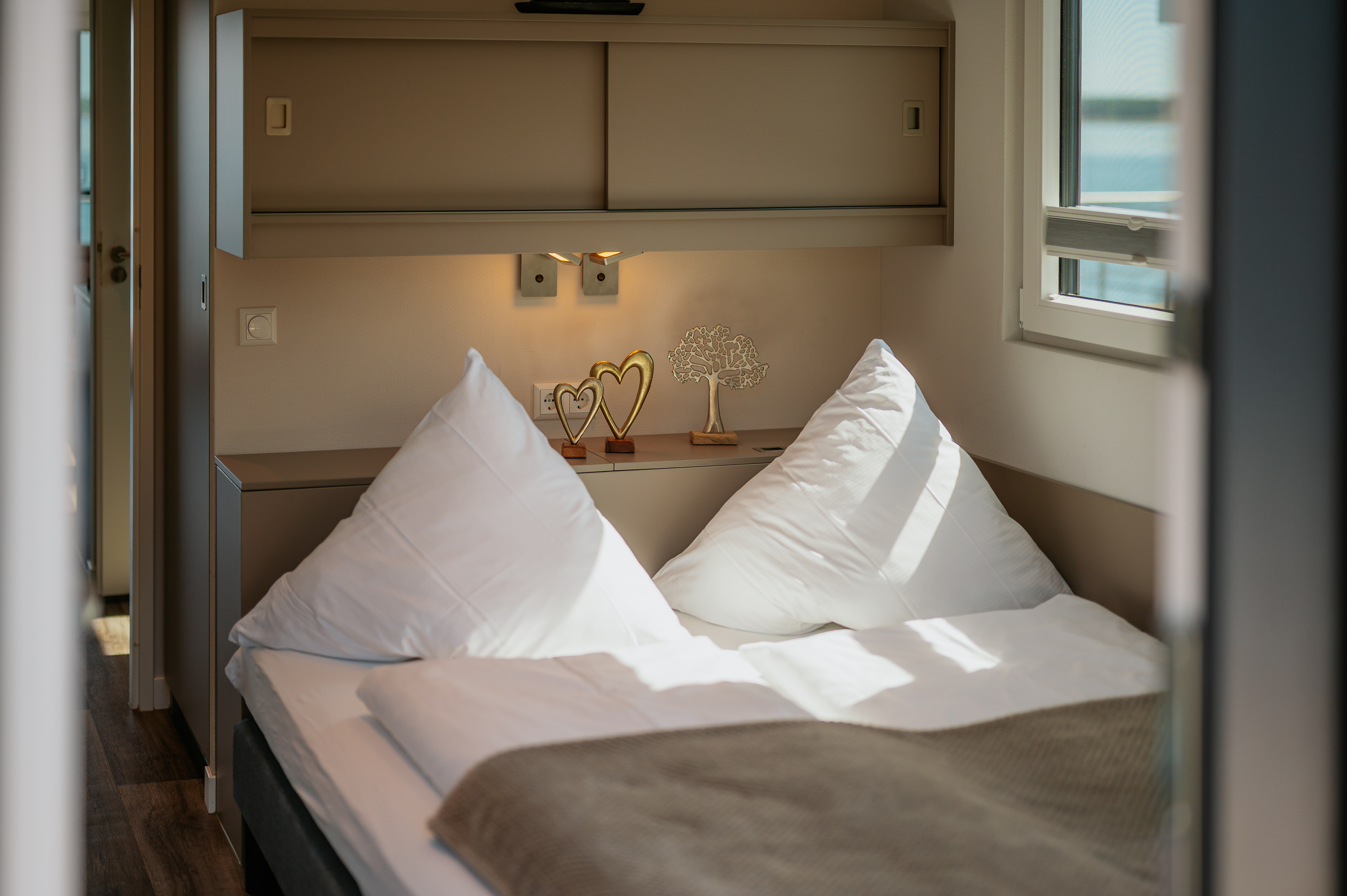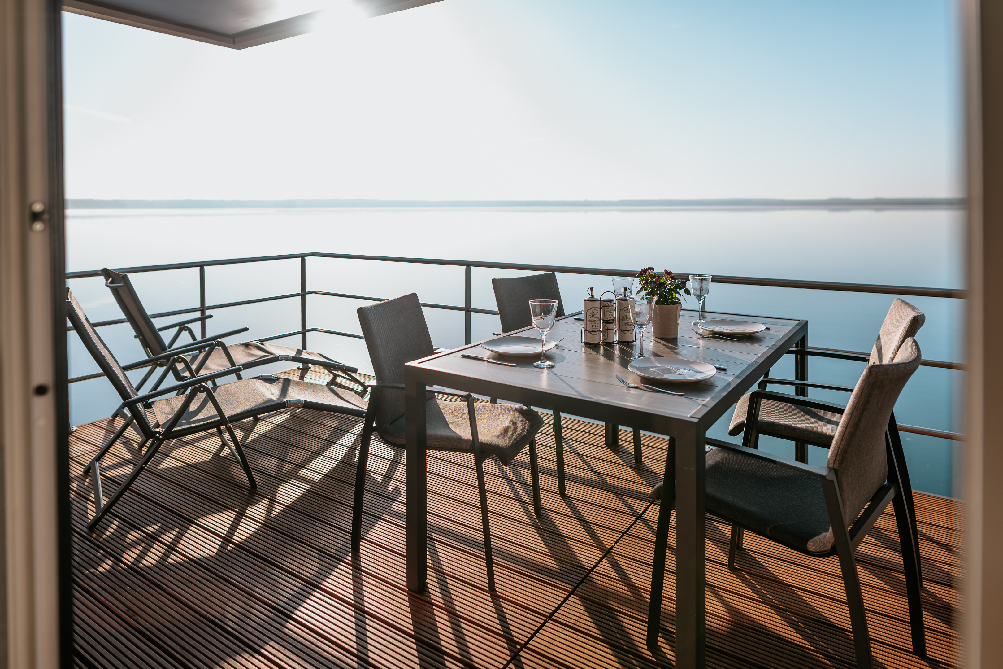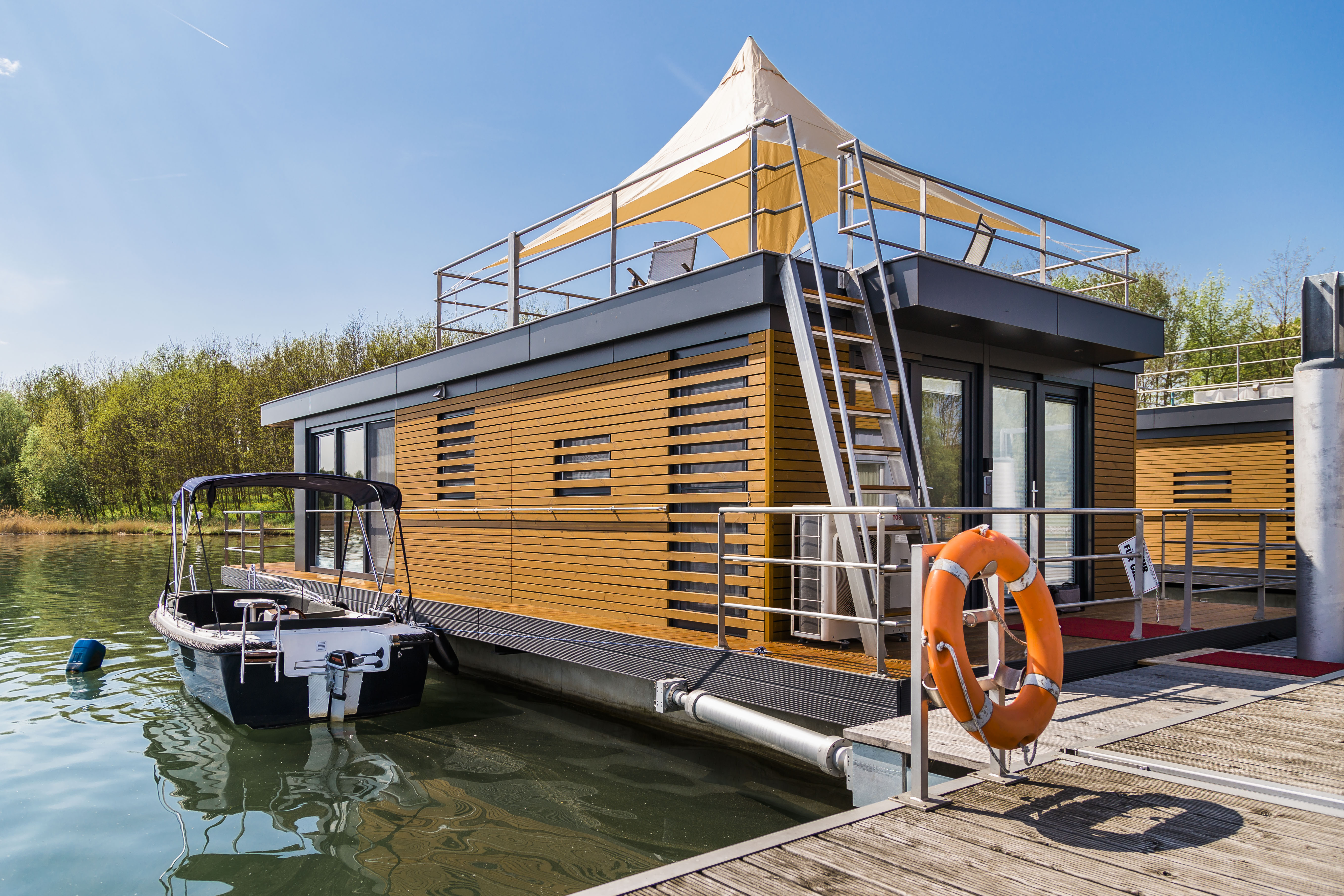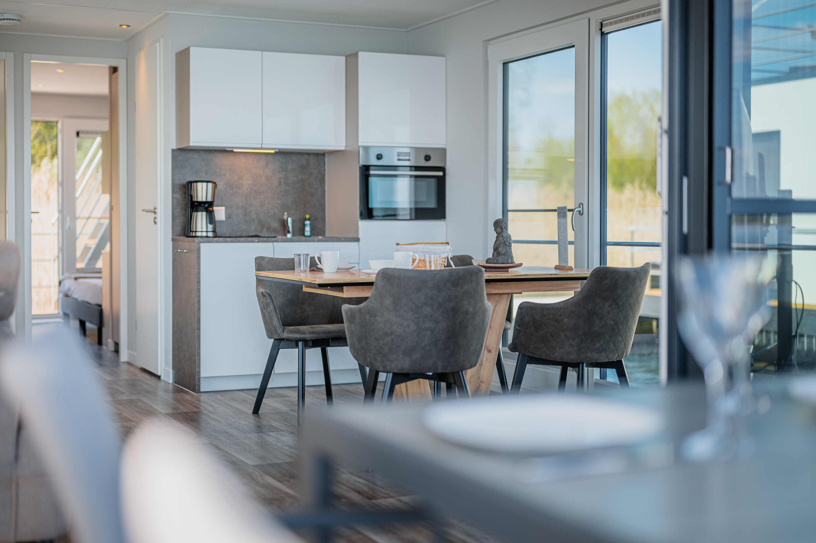 Unsere schwimmenden Ferienhäuser verbinden Freiheit mit modernem Komfort: helle Wohn- und Essbereiche mit hochwertig ausgestatteter Küche, zwei separate Schlafzimmer, Badezimmer mit Dusche sowie ein separates WC großzügige Terrassen mit Panoramablick.