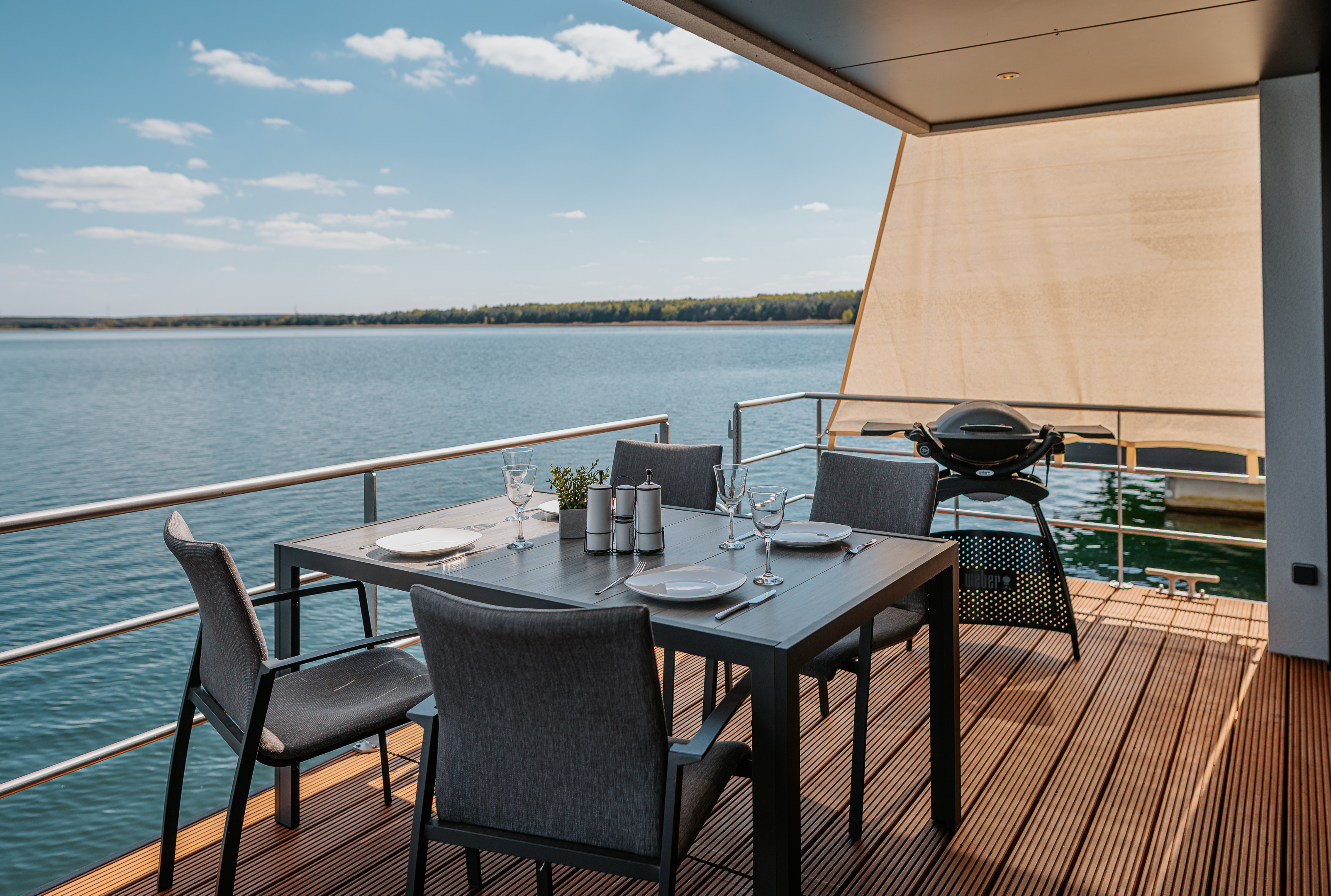 Auf dem Gräbendorfer See erwarten Sie unvergessliche Momente: Aufwachen mit Blick auf das glitzernde Wasser, Genussmomente auf der Sonnenterrasse, Entspannung auf der Dachterrasse mit atemberaubendem 360°-Panorama – und jederzeit der Sprung direkt ins erfrischende Nass.